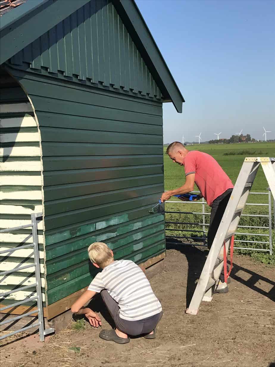 Momenteel wordt de laatste hand gelegd aan het verven van het nieuwe geitenverblijf. De geiten maken er al graag gebruik van, en er is ruimte voor alle vijf geiten.