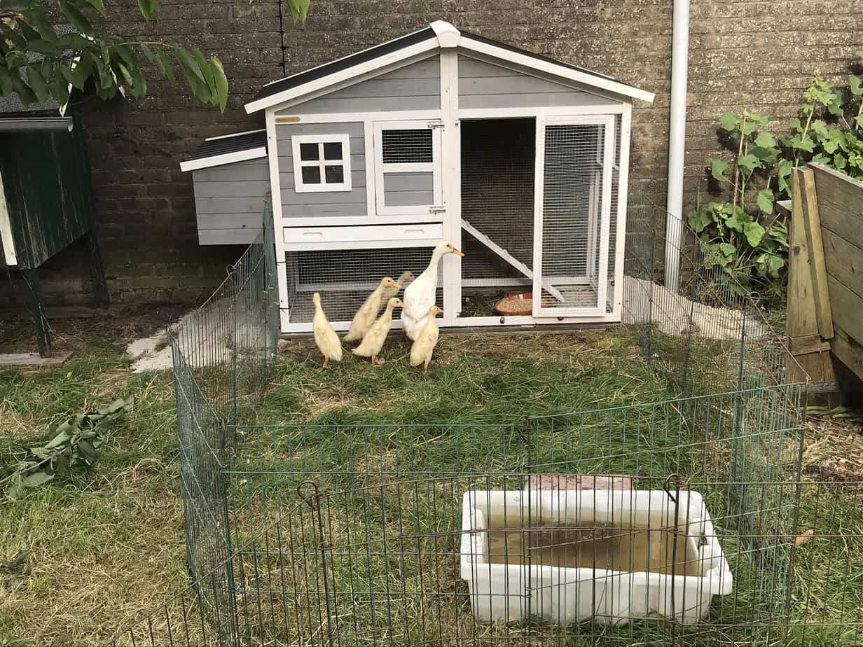 Ze zitten tijdelijk even in een ren om te wennen aan hun nieuwe plekje, maar over een paar weken kunnen ze vrij zwemmen in de sloten rondom de boerderij. We hopen dat ze heel veel slakken zullen eten!